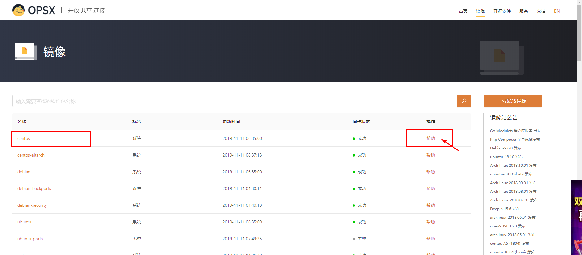 因本人长期使用阿里云的主机,所以常用的Yum源也就近使用的阿里巴巴开源镜像站,即http://opsx.alibaba.com,打开该网址后,点击镜像,可看到如下信息