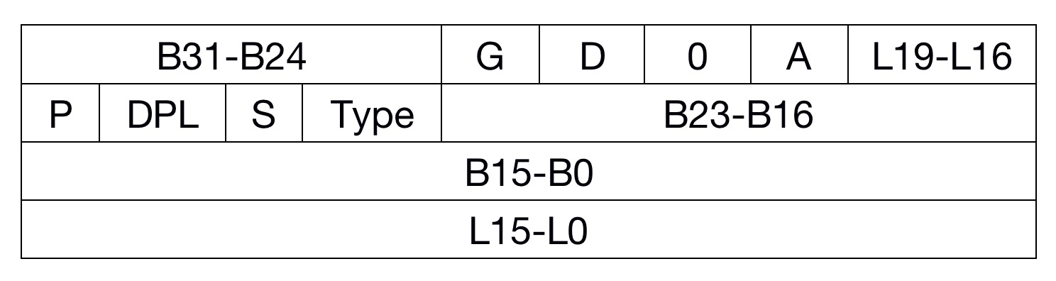 如此奇怪的描述项结构,其实是因为Intel一开始是想使用24位地址,后来才省悟到要用32位地址,但当时286(24位地址总线)已经发售了(描述项也使用4个字节,31-24位做为保留),只能通过这种打补丁的方式来完成32位地址的扩充,明白了这点,能更好地理解描述项的结构。
