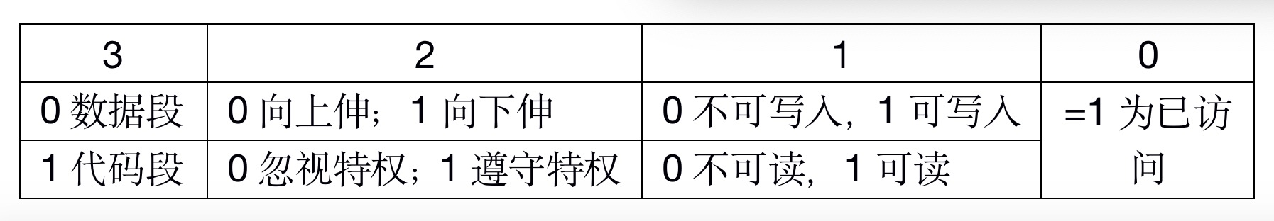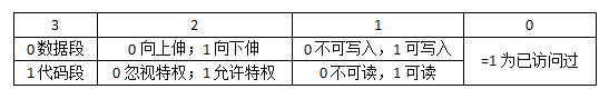 3位为0时,2位为0表示一般的数据段,为1表示堆栈;3位为1时,2位为0表示只能被同级代码段访问,为1表示可从低特权跳转过来执行。