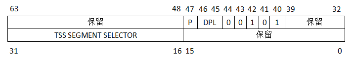 任务门:当中断信号发生时,取代当前进程的那个进程TSS选择符将放入TSS SEGMENT SELECTOR中