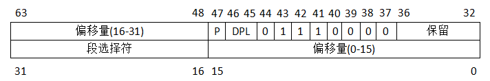 陷阱门:包含段选择符和中断异常处理代码的段内偏移量,当跳转到相应处理时,不清除IF标志,可触发其他可屏蔽中断。